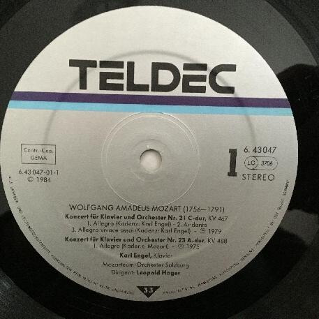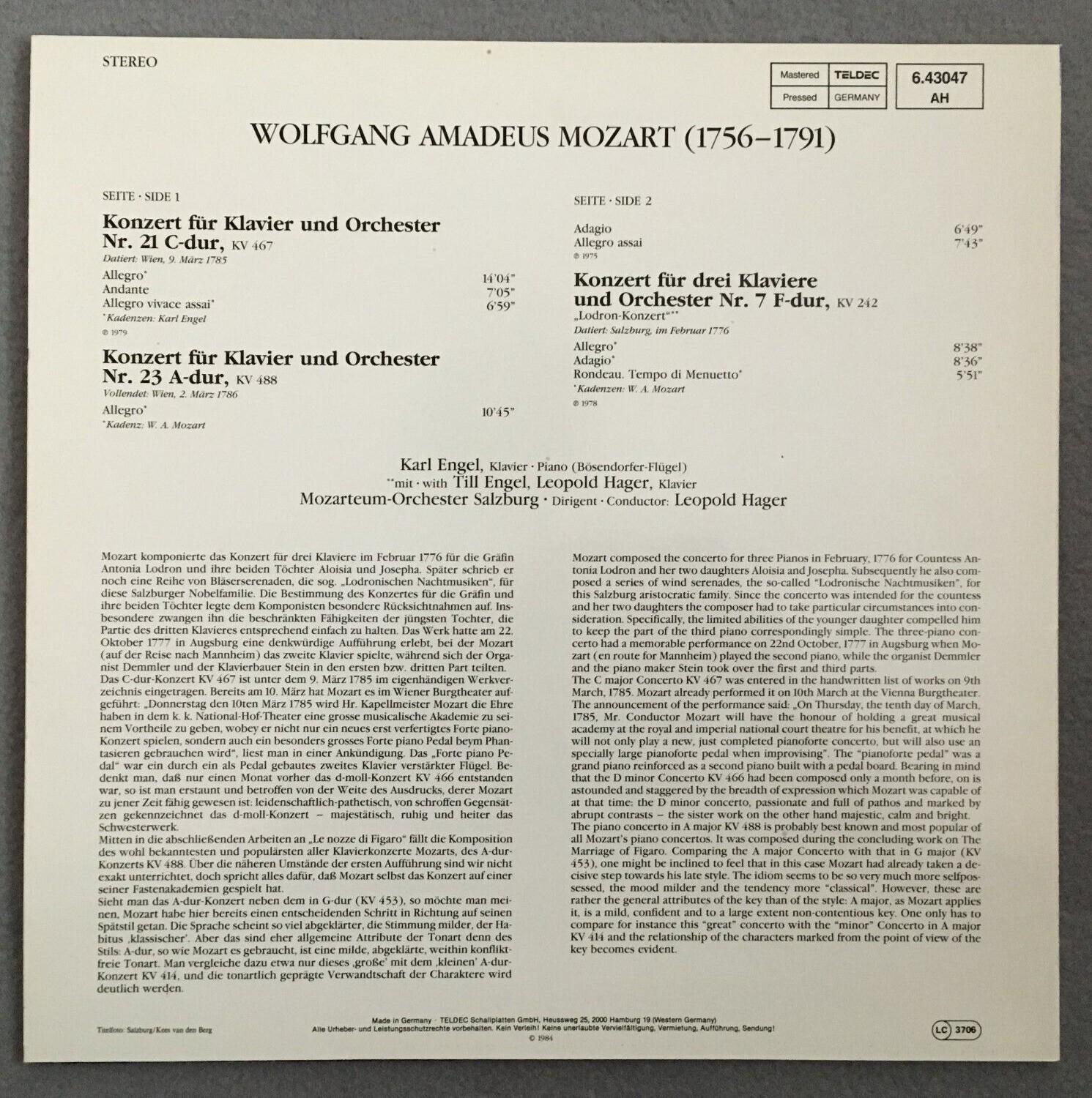 P199 Mozart Piano Concertos Karl Engel Hager Teldec 6.43047 AH Stereo
