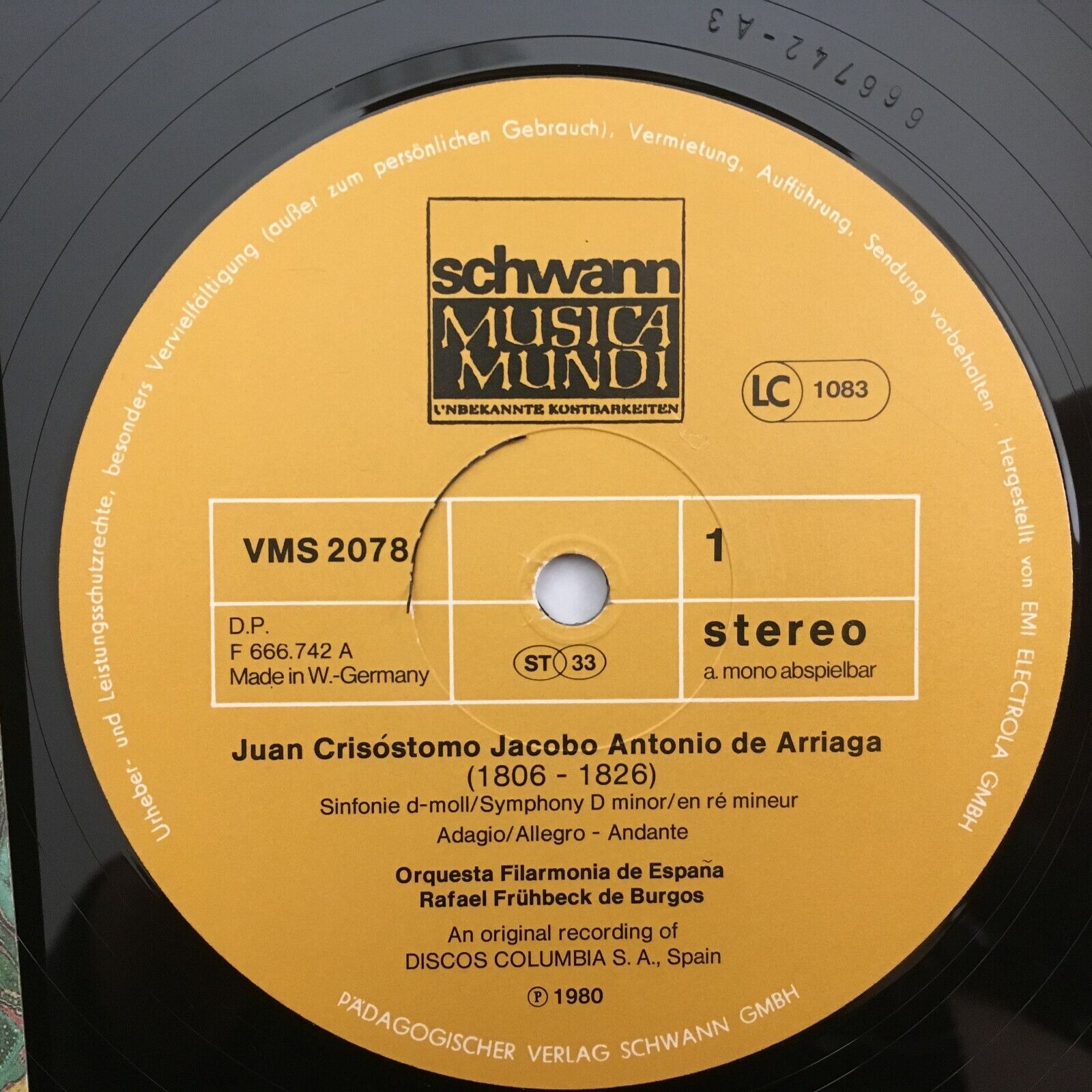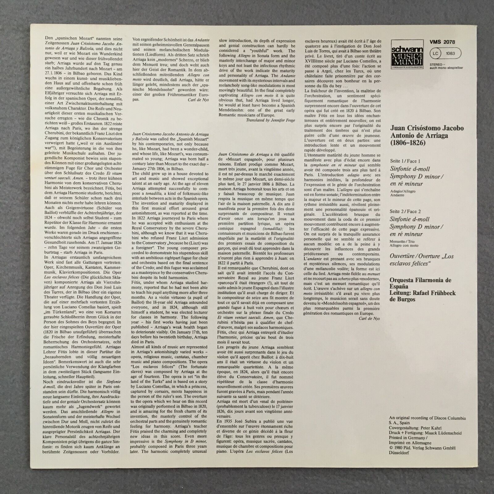 X355 De Arriaga Symphonies Overture De Burgos Schwann VMS 2078 Stereo
