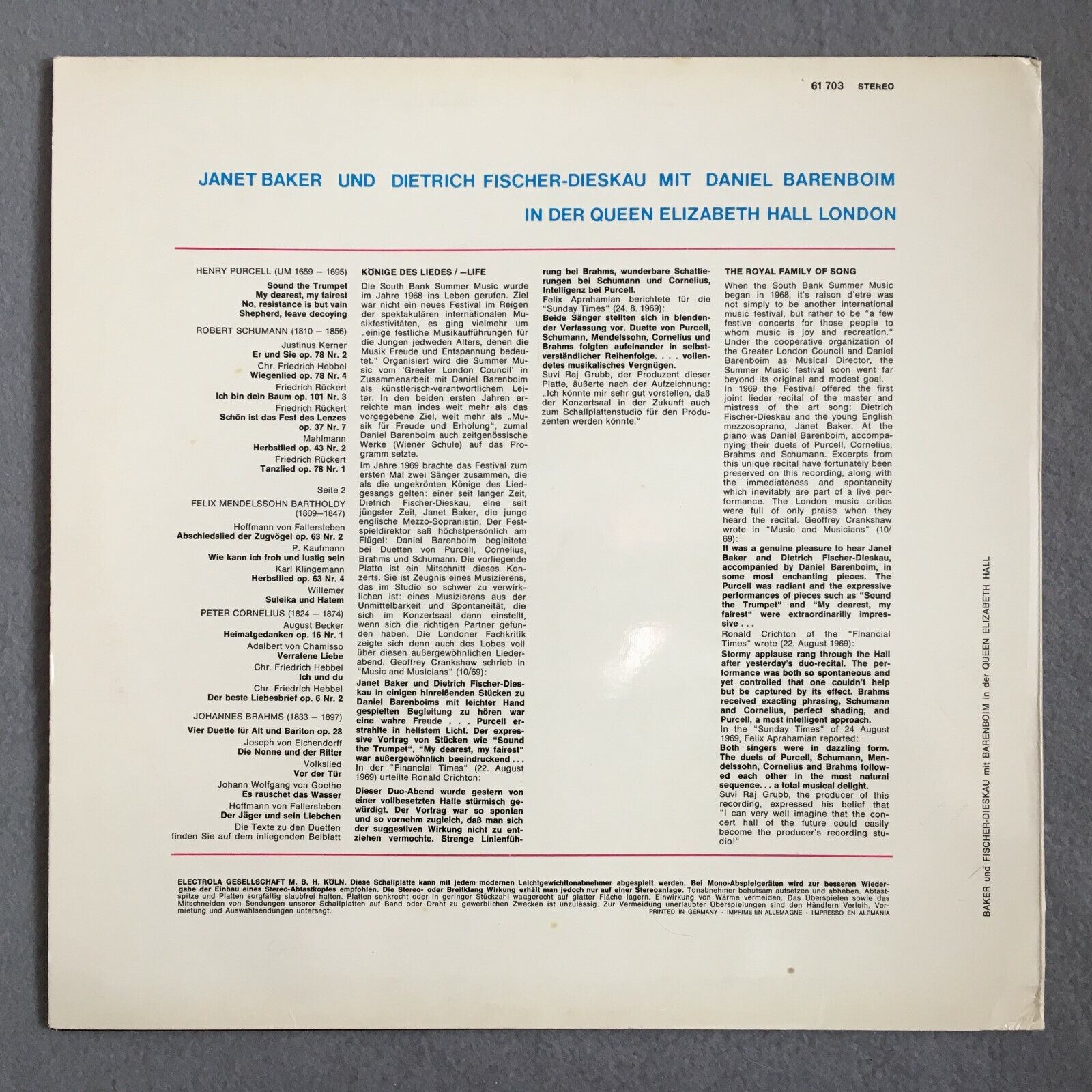 X531 Duette Baker Fischer-Dieskau Brahms Schumann Barenboim EMI 61 703 Stereo