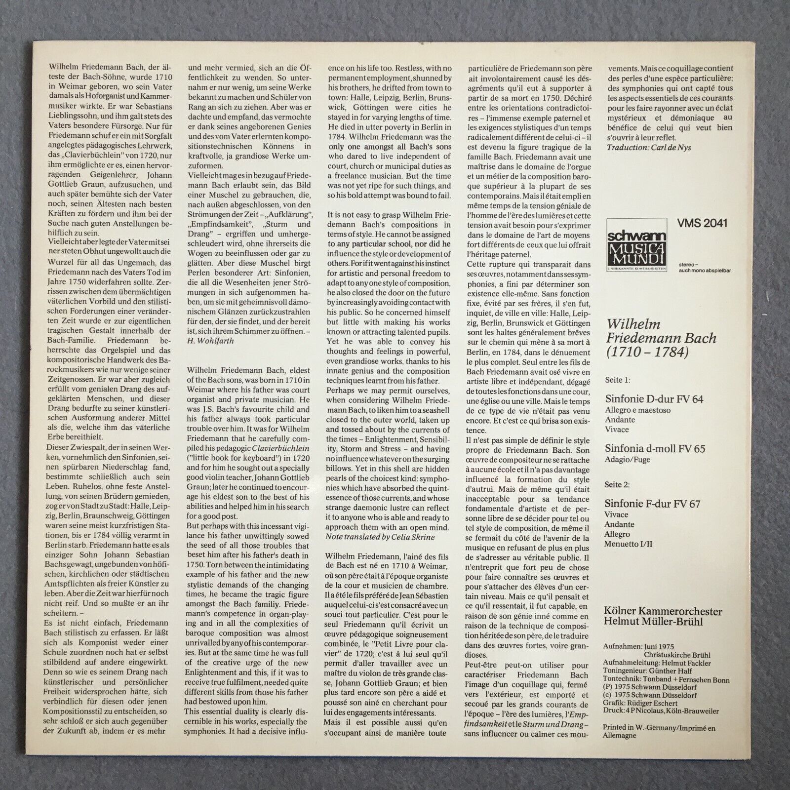 X537 W.F. Bach Symphonies Müller-Brühl Schwann MM VMS 2041 Stereo