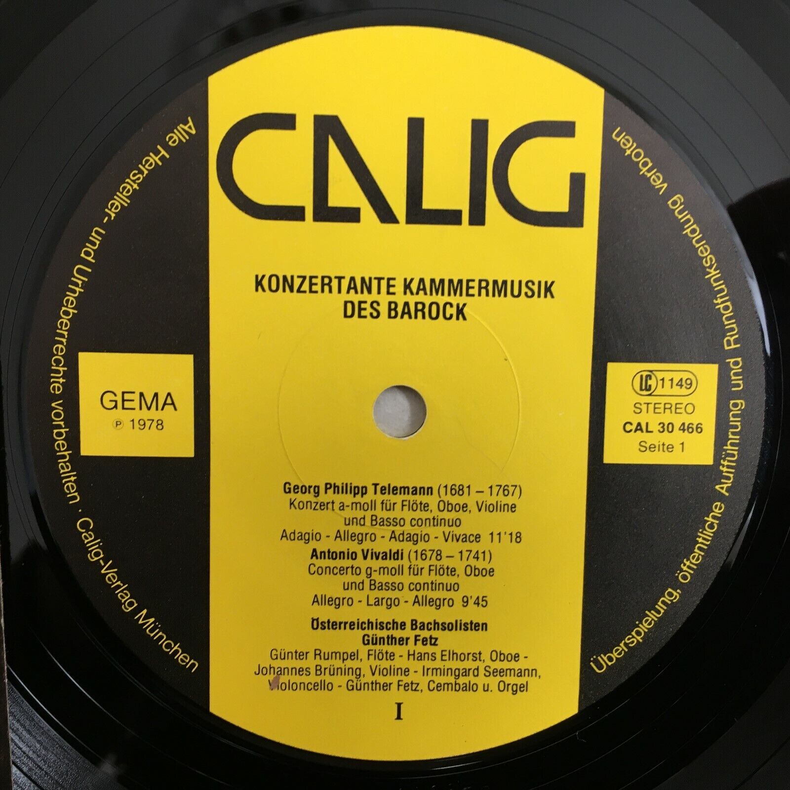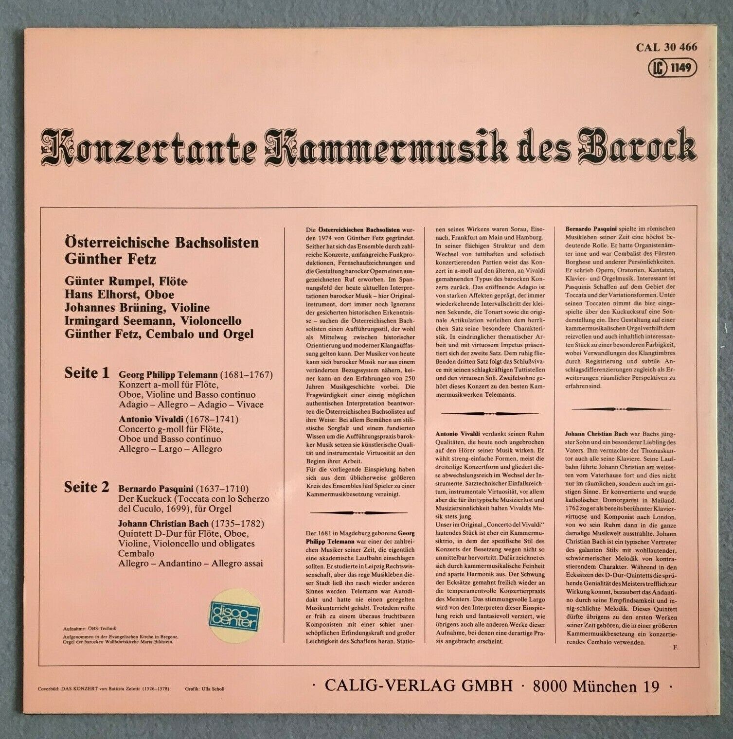 X538 Baroque Chamber Music Fetz Rumpel Seemann Calig CAL 30 466 Stereo