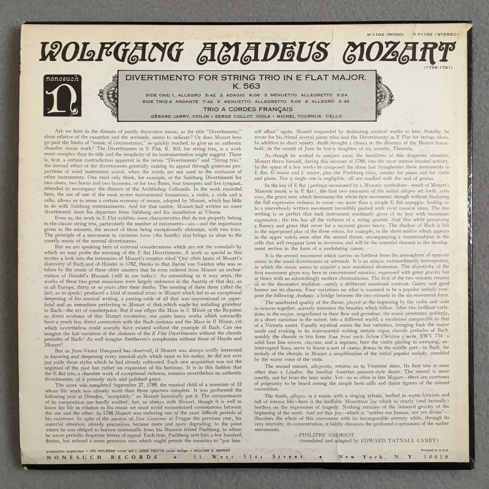 X629 Mozart Divertimento for String Trio Jarry Collot Nonosuch H-71 102 Stereo