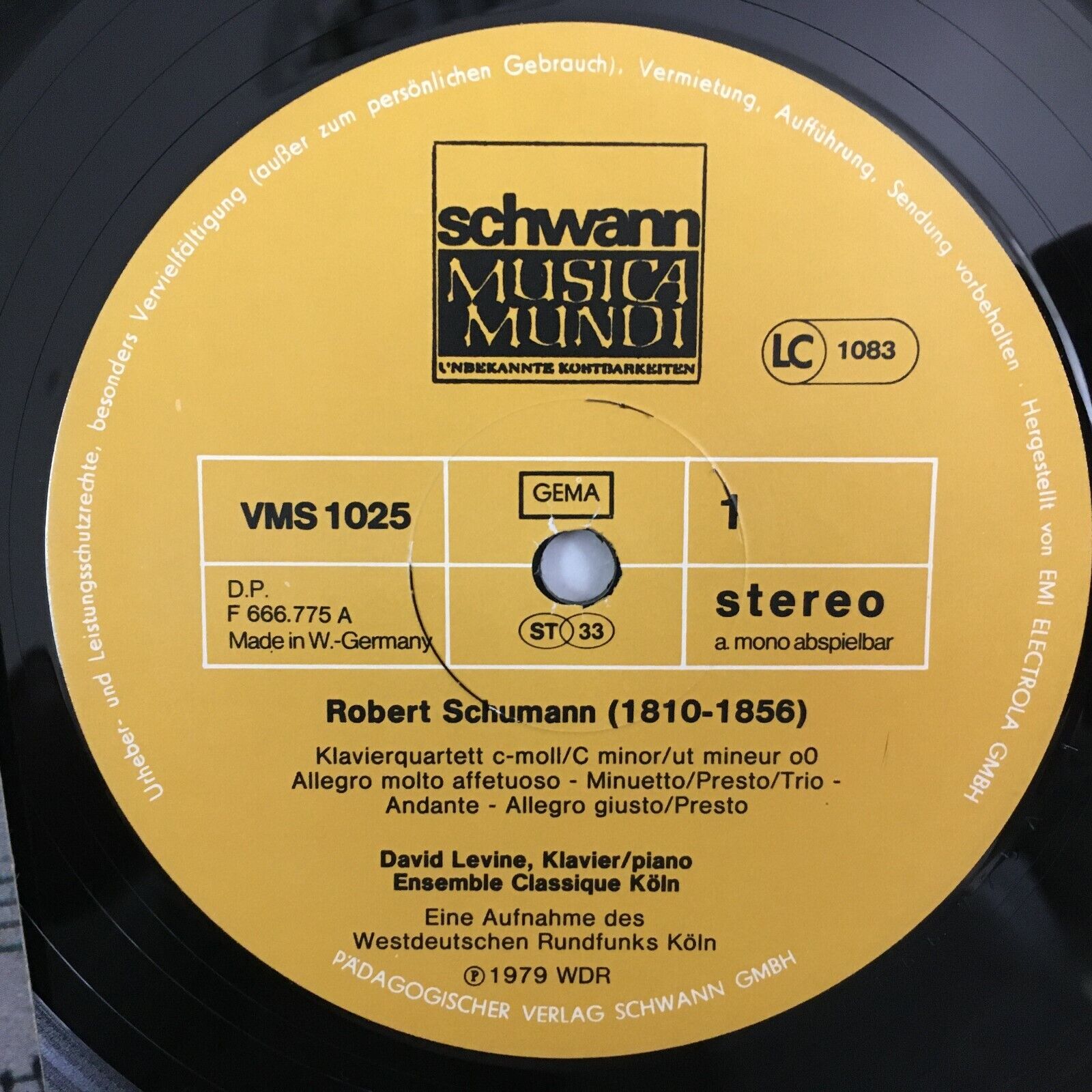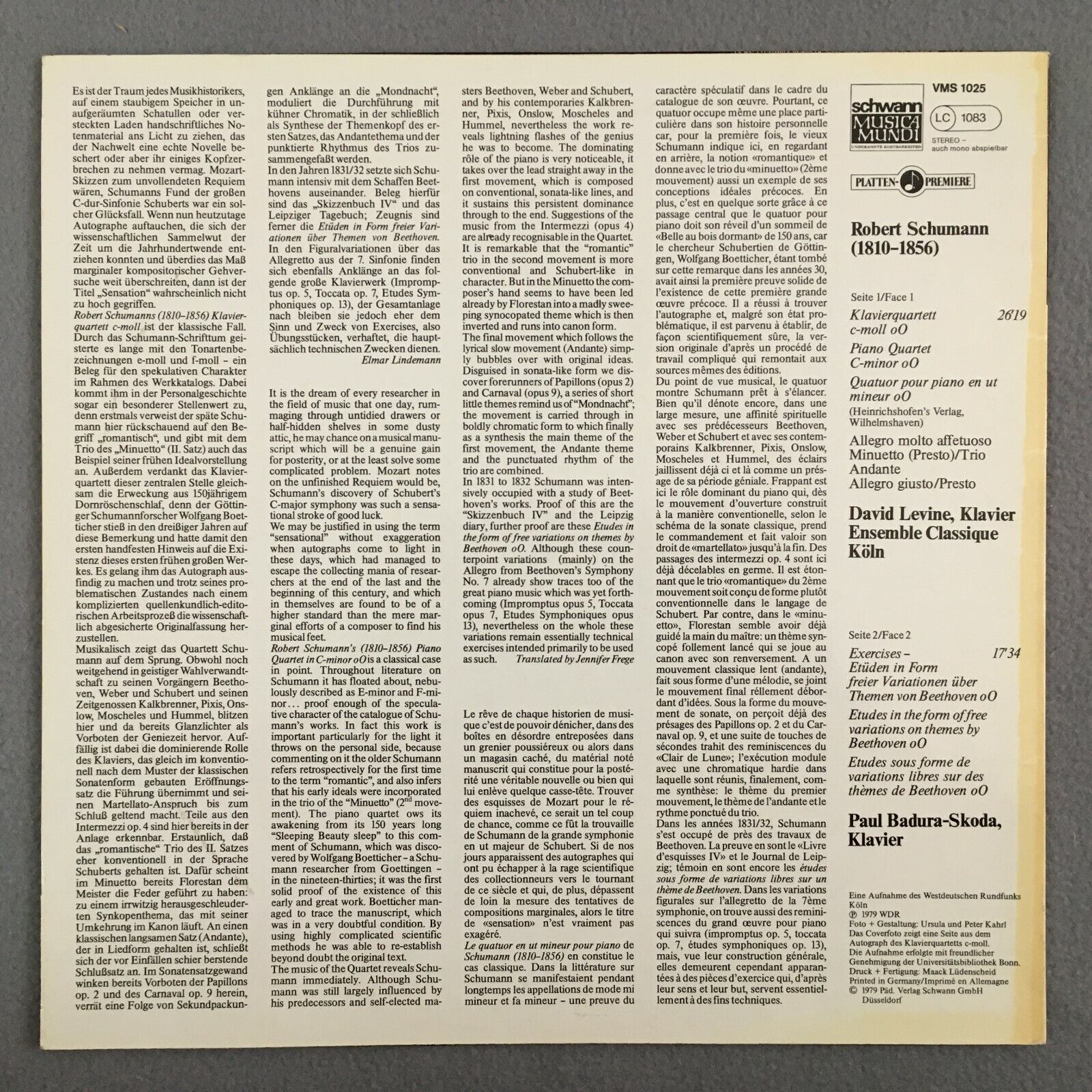 Z832 Schumann Piano Quartet Etudes Levine Badura-Skoda Schwann VMS 1025 Stereo