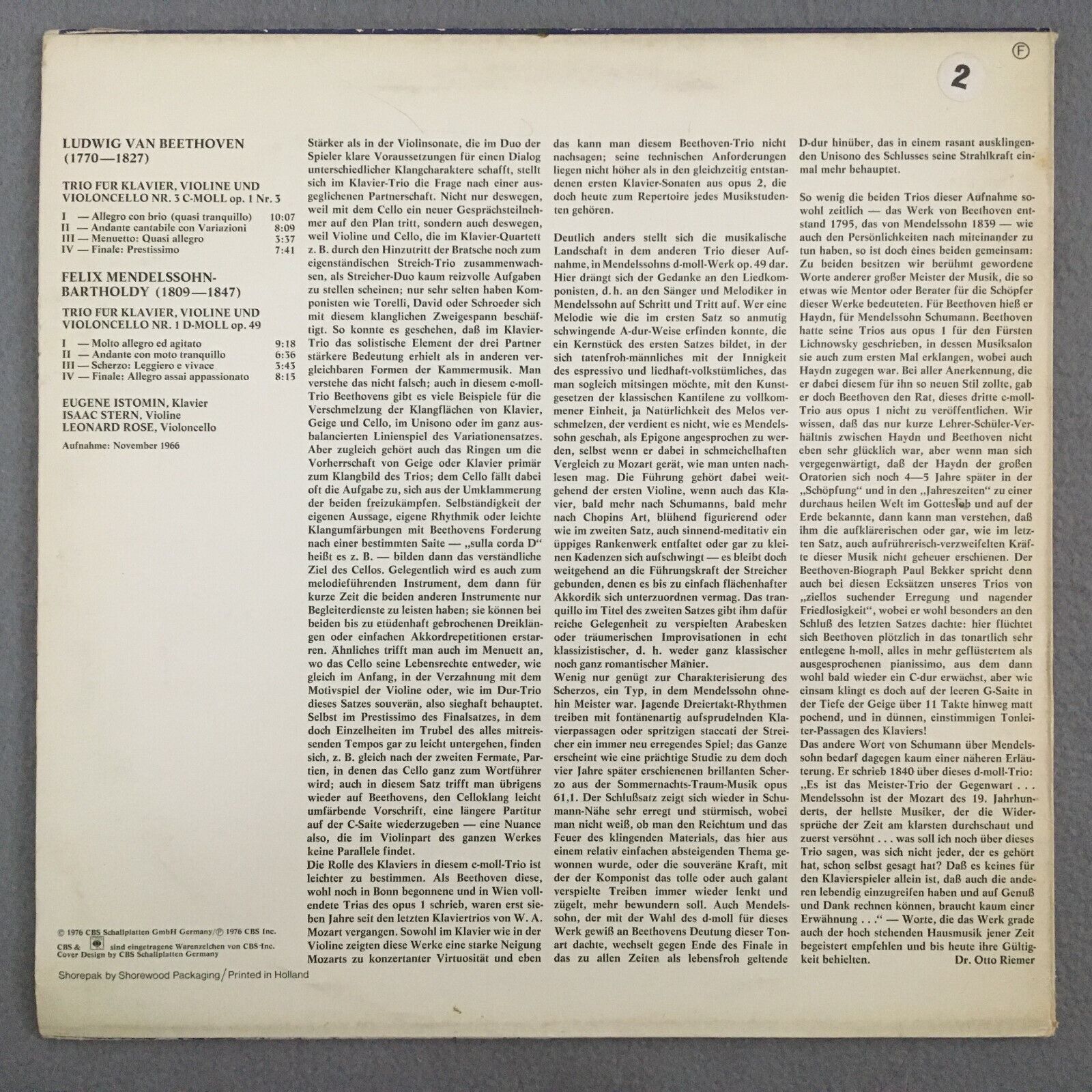 Z982 Beethoven Mendelssohn Piano Trios Rose Stern Istomin CBS 61 668 Stereo