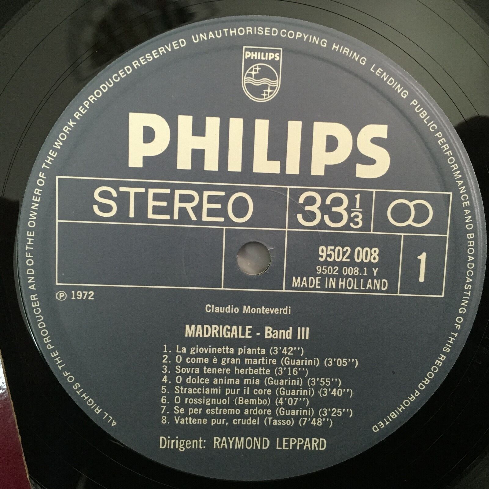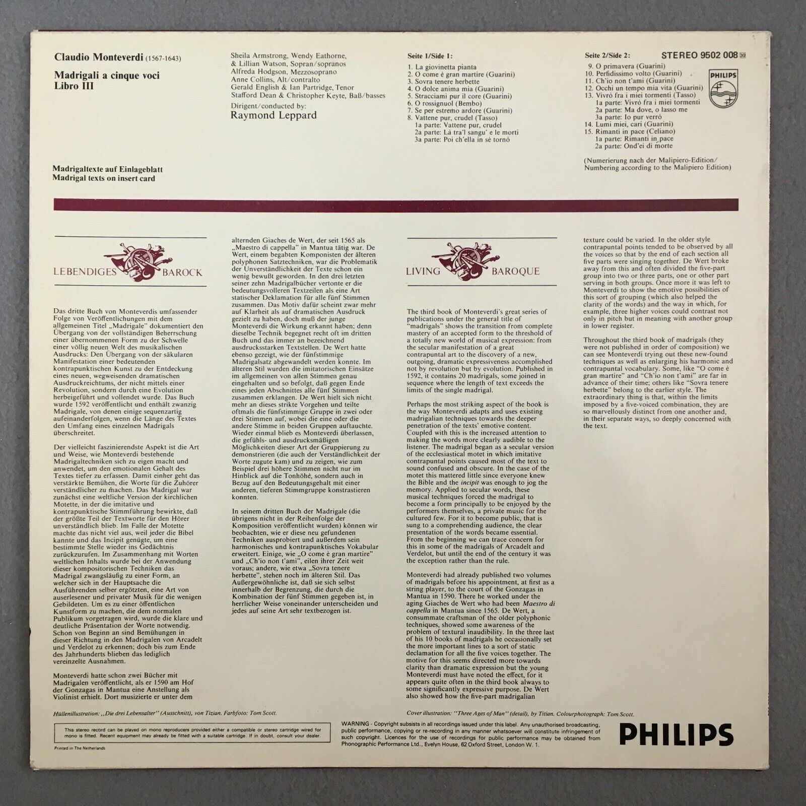 Y014 Monteverdi Madrigali Libro III Armstrong Leppard Philips 9502 008 Stereo