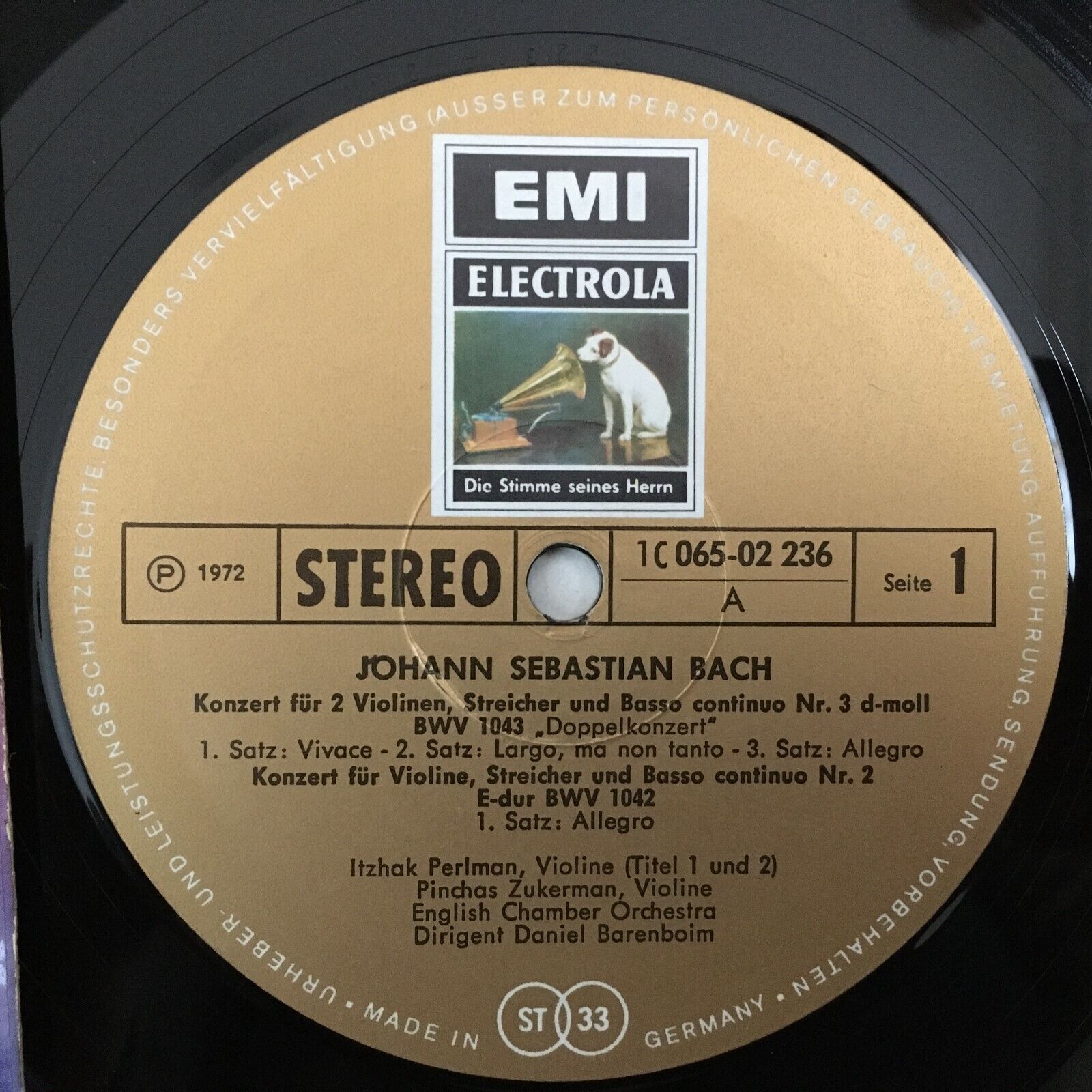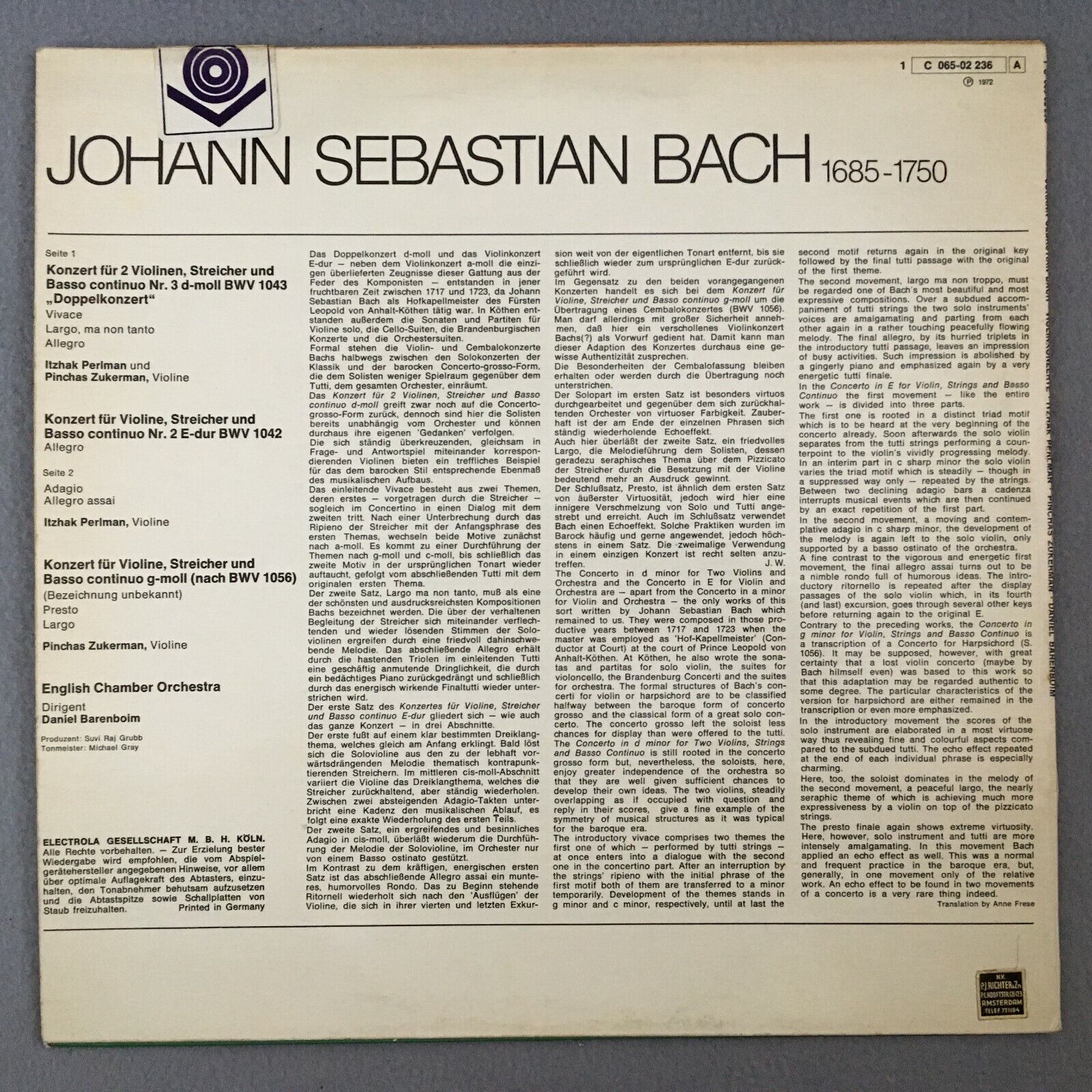 Y082 Bach Violin Concertos Perlman Zukerman Barenboim EMI 1 C 065-02 236 Stereo