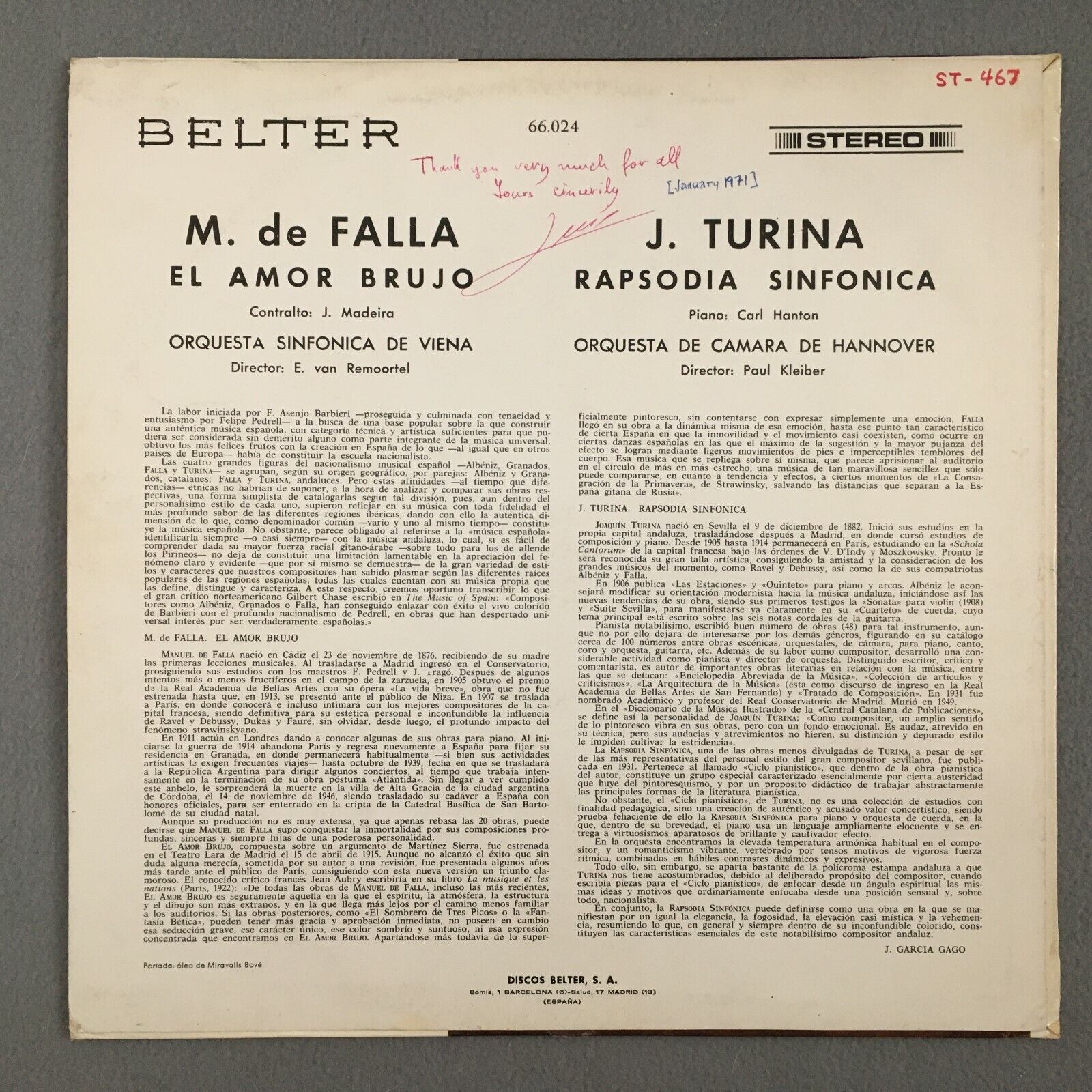 Y236 De Falla El Amor Brujo Turina Rhapsody Kleiber Belter 66.024 Stereo