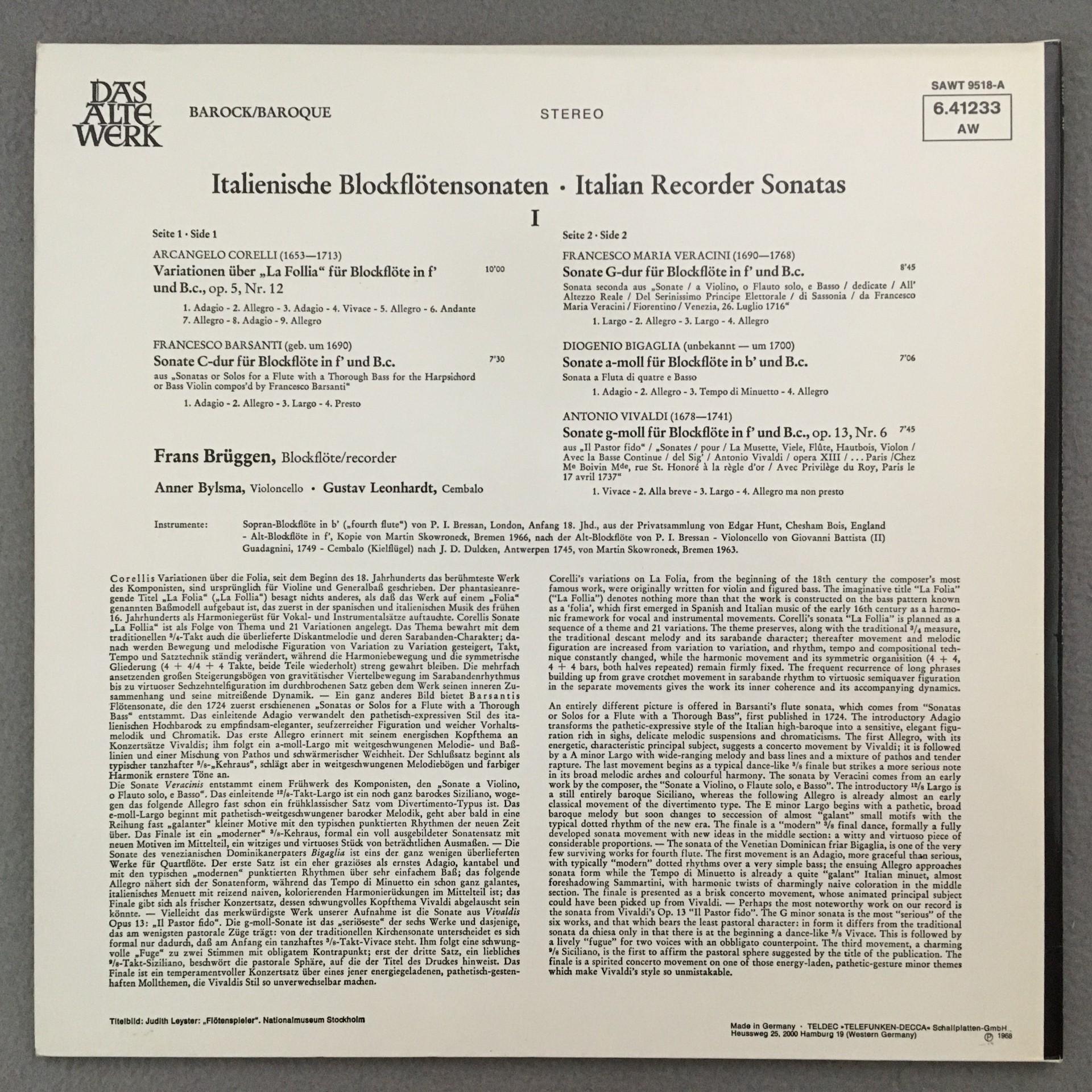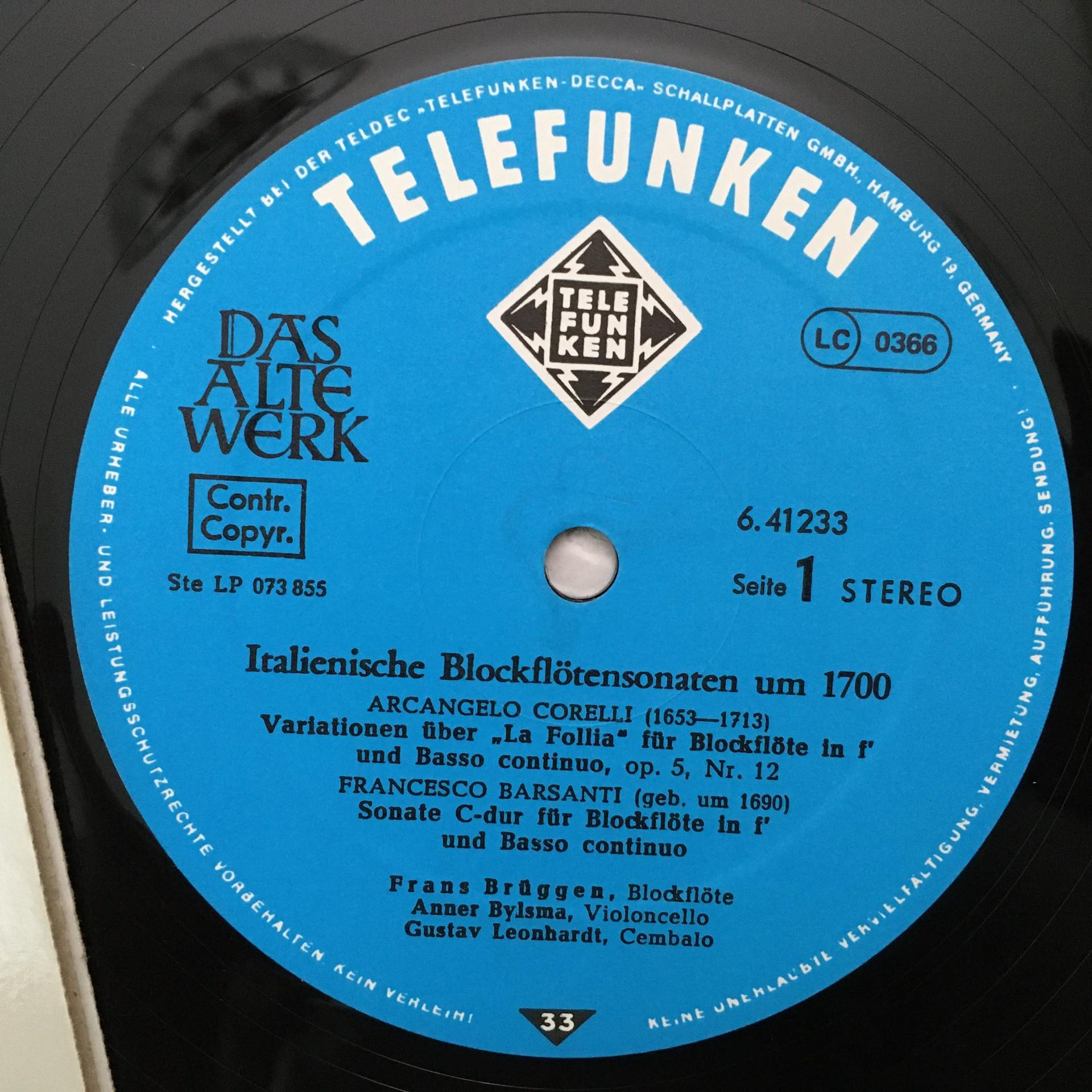 M186 Italian Recorder Sonatas Corelli Vivaldi Leonhardt Telefunken 6.41233 AW St