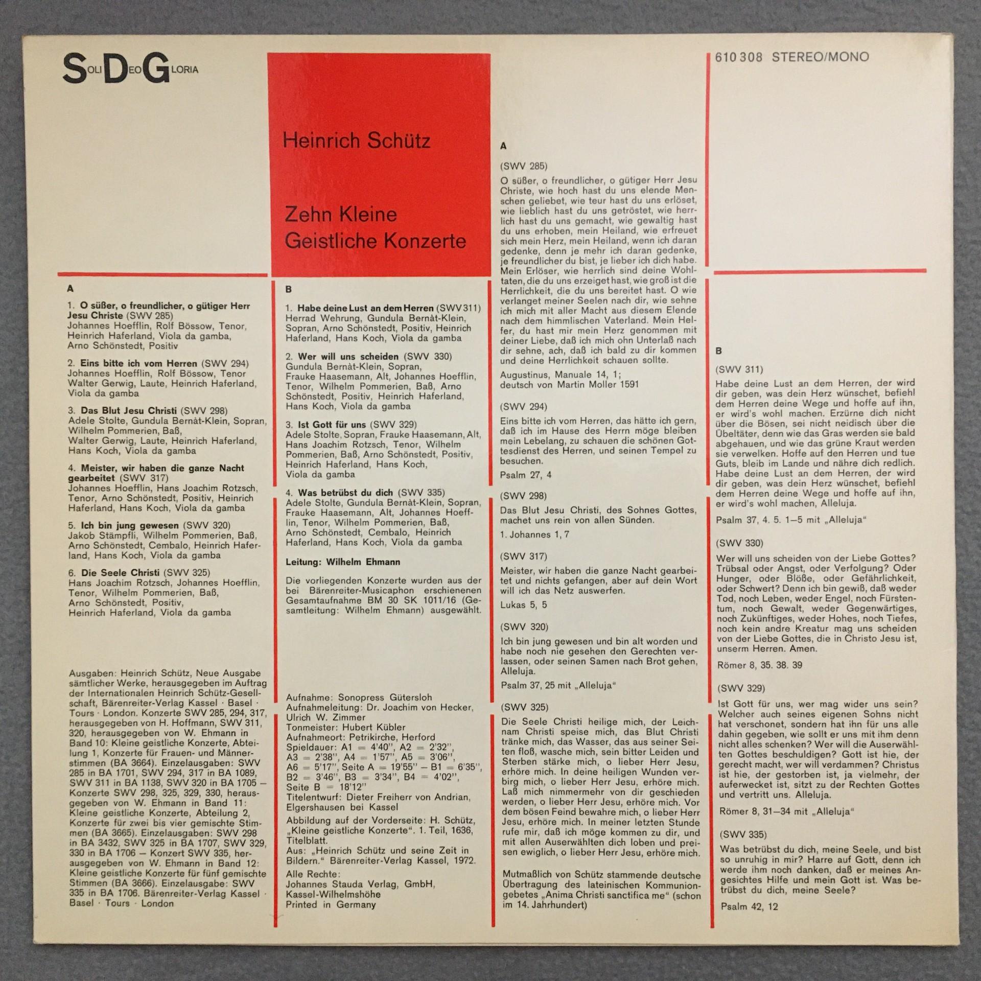 M222 Schütz Sacred Concertos Bernat-Klein Stolte Ehmann SDG 610 308 Stereo