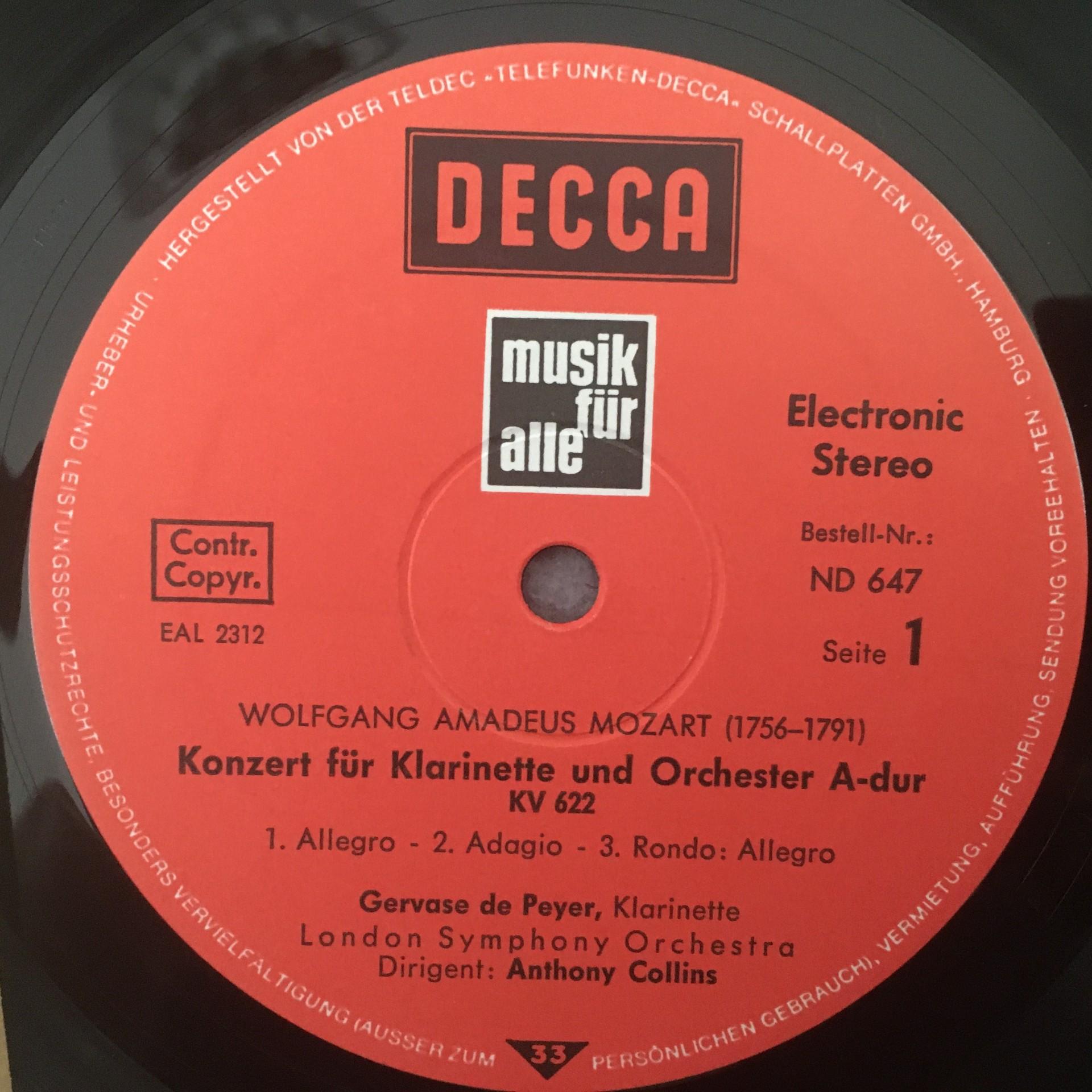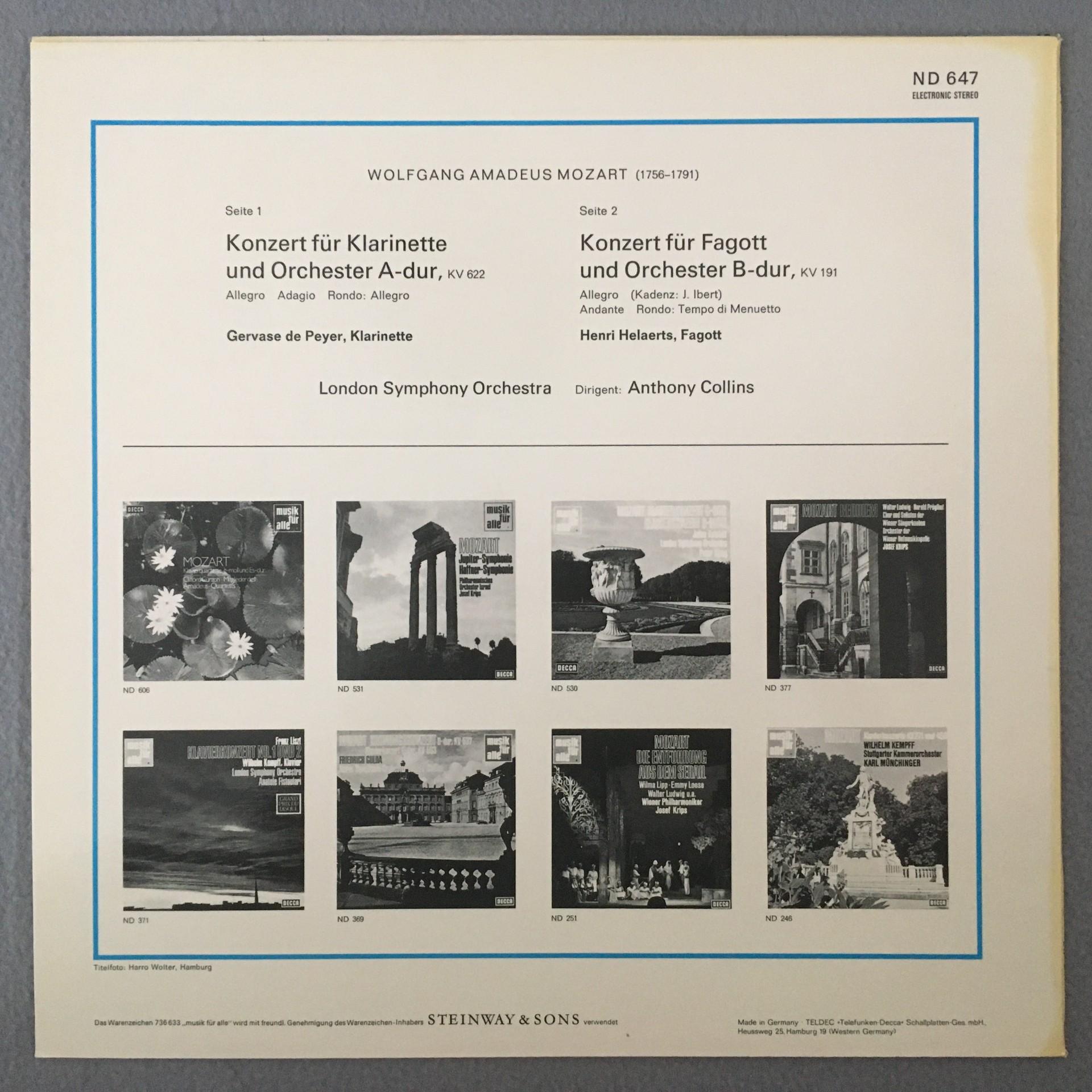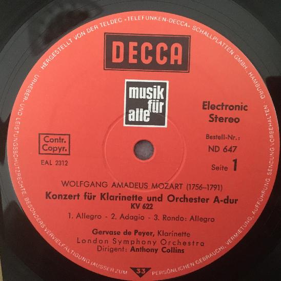 M285 Mozart Concertos De Peyer Helaerts Collins DECCA ND 647 Stereo