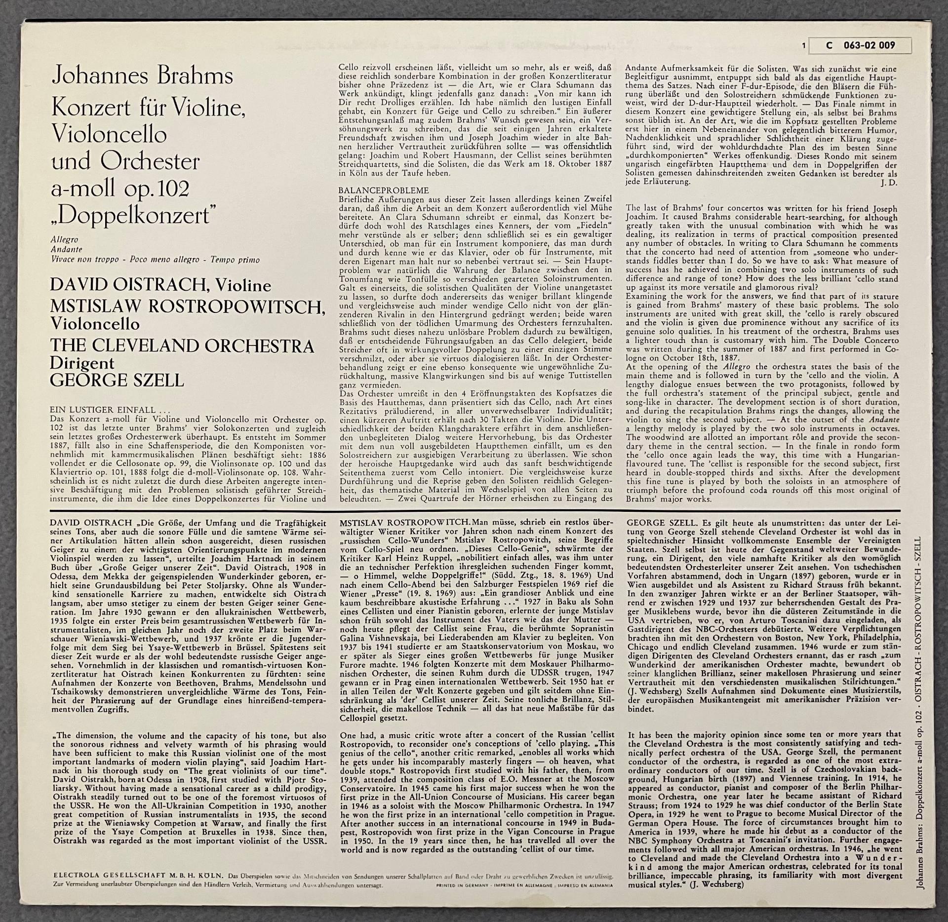 M601 Brahms Double Concerto Oistrakh Rostropovich Szell EMI 1 C 065-02 009 St