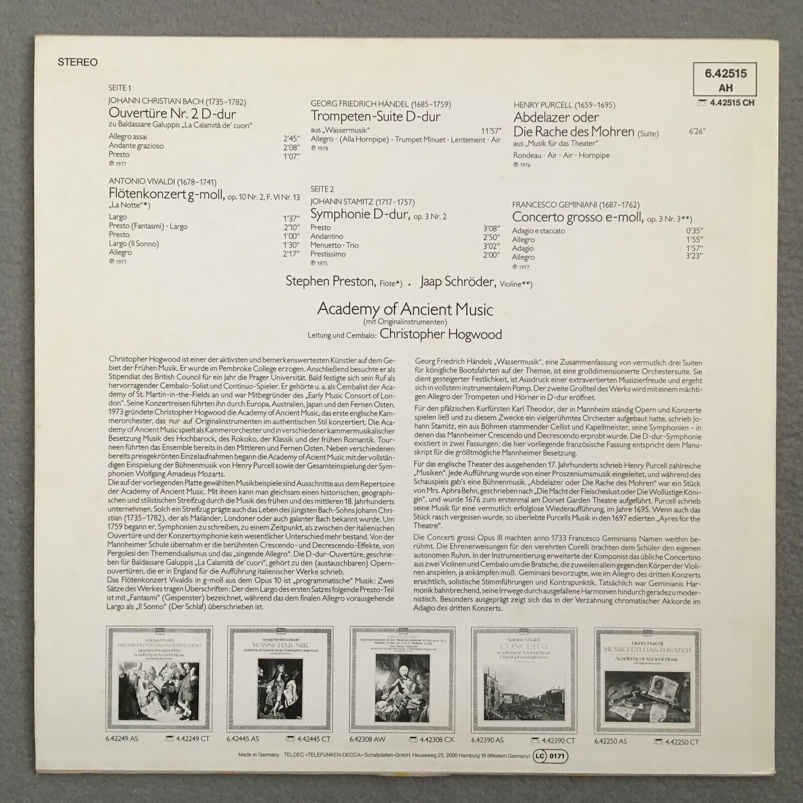 P469 J.C. Bach Vivaldi Handel Schröder Preston Hogwood DECCA 6.42515 AH Stereo