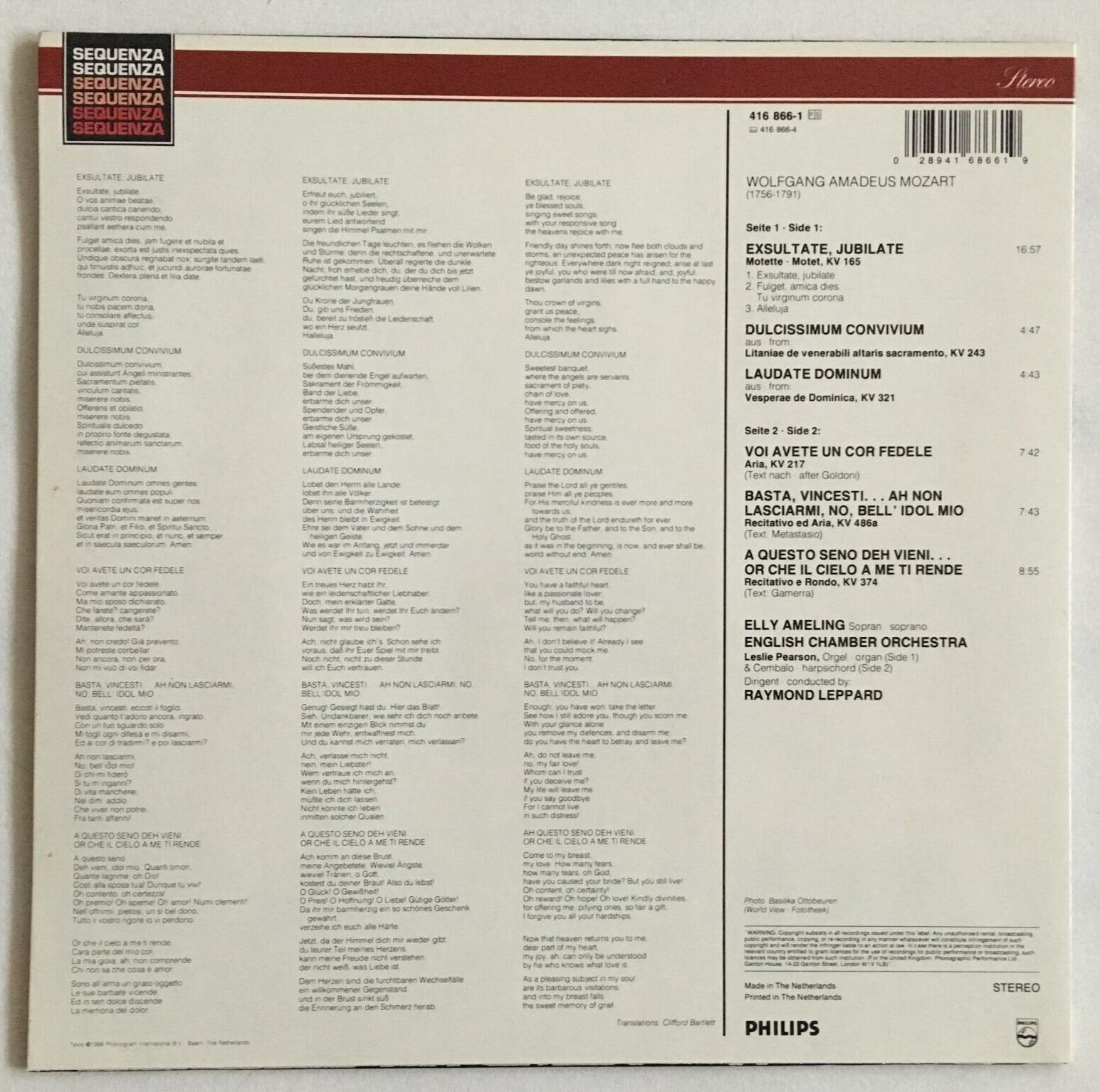 P125 Mozart Exsultate Jubilate Ameling Leppard Philips 416 866-1 Stereo