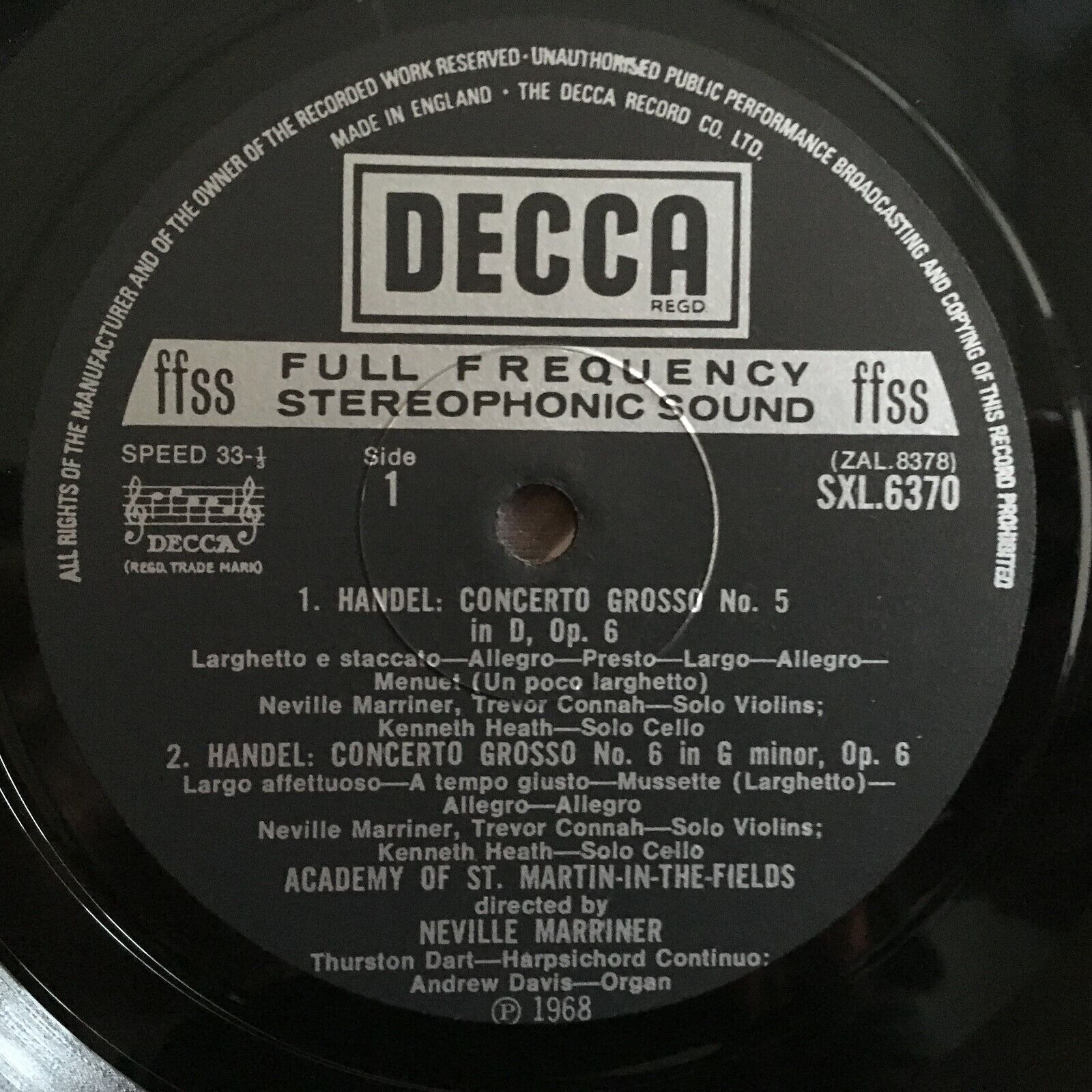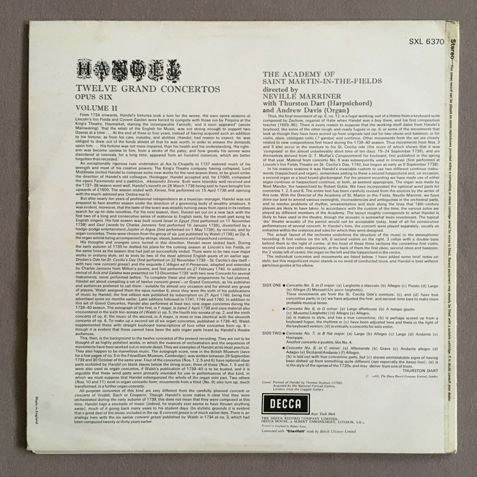 X064 Handel 12 Concertos Vol II Dart Davis Marriner DECCA SXL 6370 Stereo