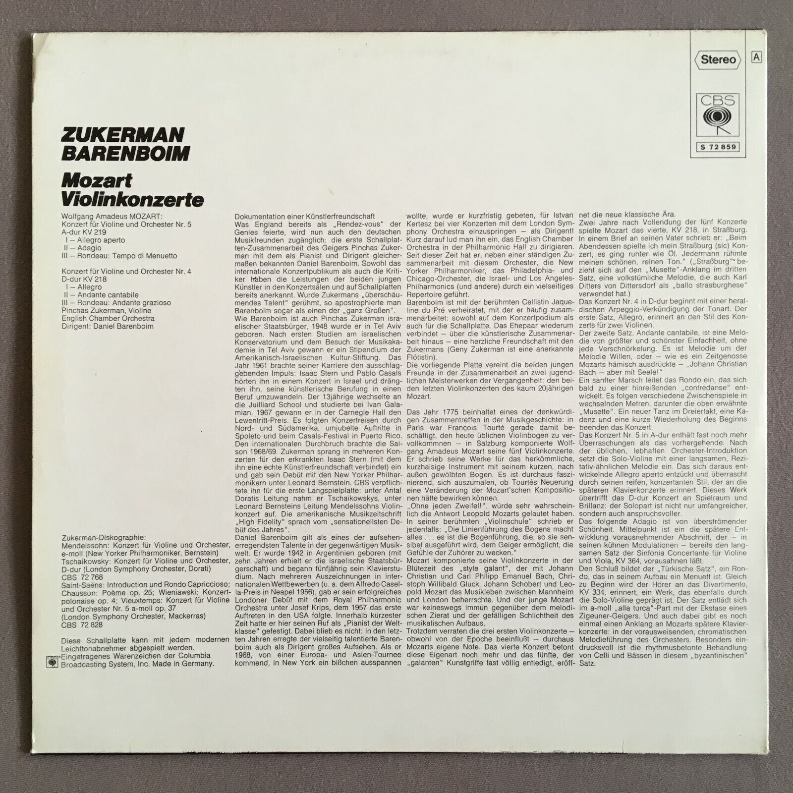 X127 Mozart Violin Concertos No.4 & No.5 Zukerman Barenboim CBS S 72 859 Stereo