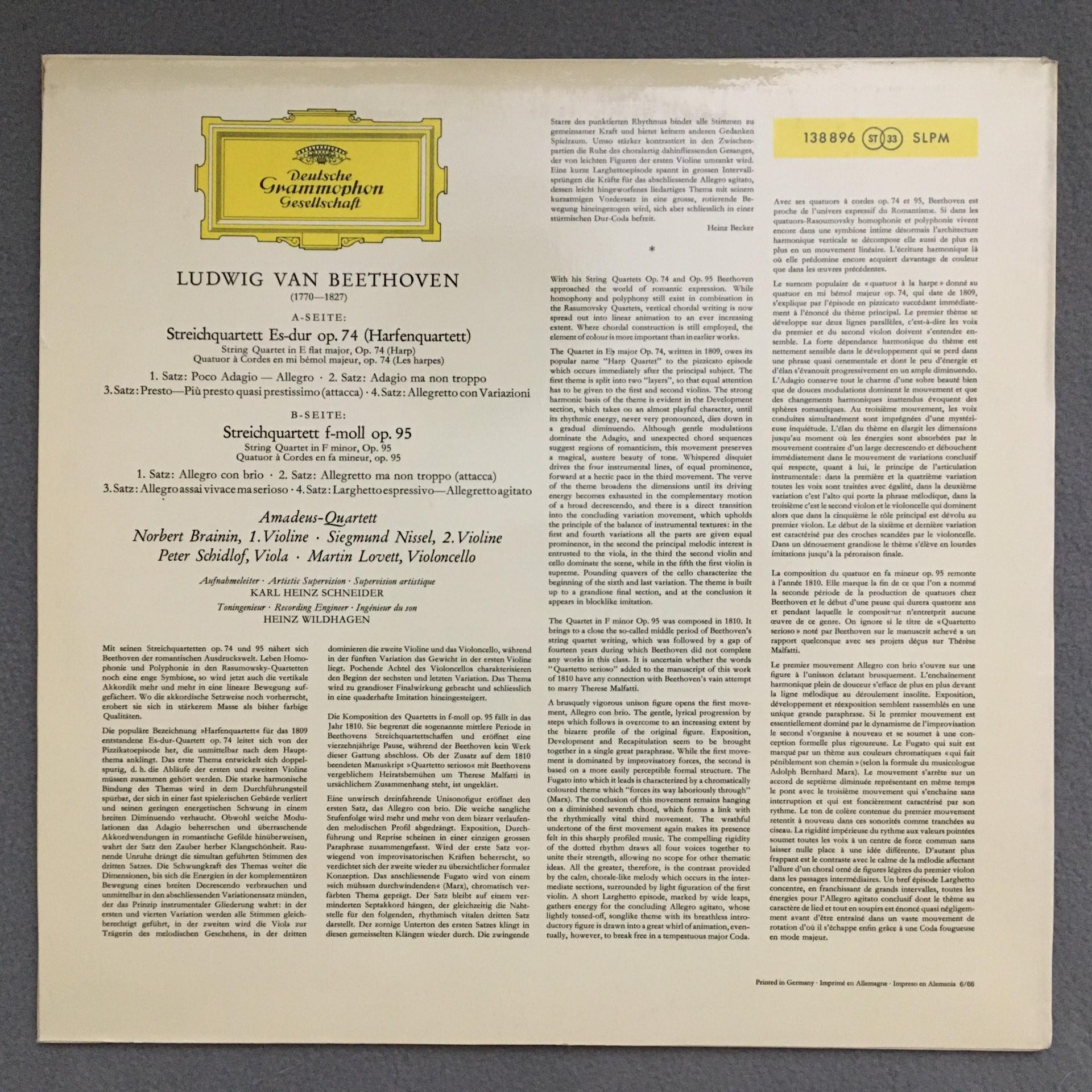 M965 Beethoven String Quartets Amadeus Quartet DGG 138 896 SLPM Stereo Tulip